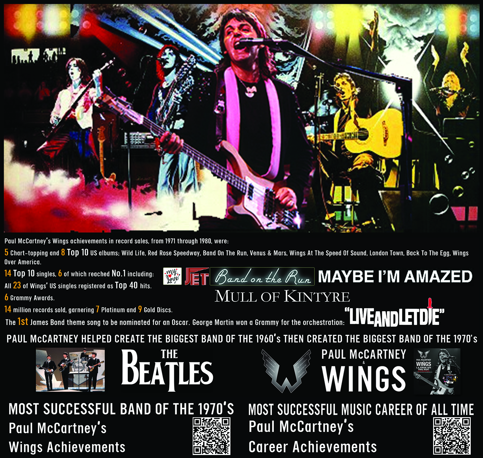 Wings toured the world and became the best-selling pop act of the 1970s, with an astonishing 27 U.S. Top 40 hits (beating Elton John’s 25) and five consecutive number one albums, including the highly acclaimed Band on the Run (1973) and Wings at the Speed of Sound (1976). – Britannica